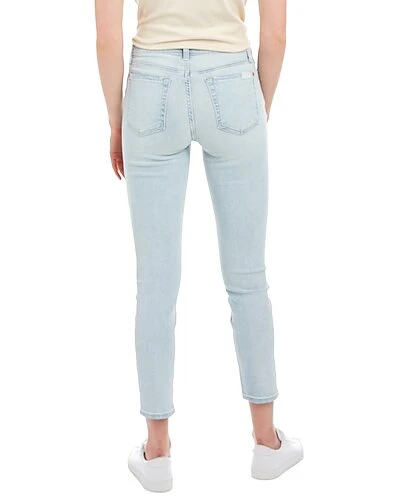 - Roxanne Ankle Cut Jean in light indigo with fading and whiskering wash, distressed accents, classic five-pocket style, and belt loops