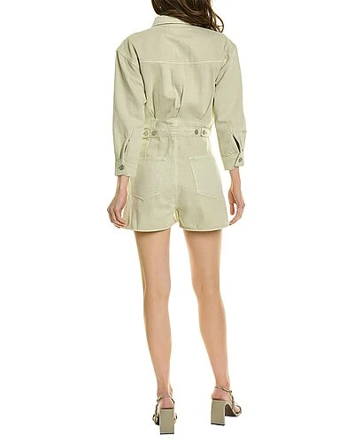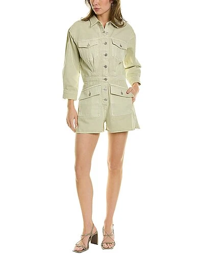 - Surplus Romper in rigid soft olive with dual chest pockets, button cuffs, four front pockets, two back pockets, and inverted pleats
