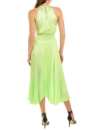 - Renzo II Midi Dress in green kick with accordion pleated satin design, smocked waist, halter neck, and asymmetrical hem