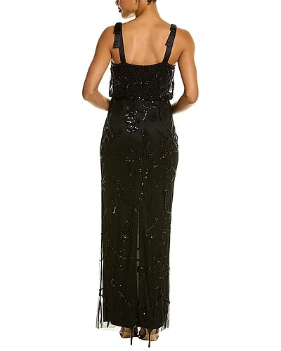 - Design details: beaded detailing, surplice bodice, center back slit