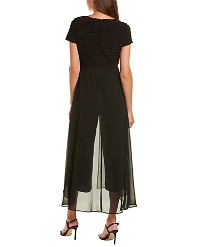 - Design details: V-neck, pintucked bodice, and flowing skirted legs
