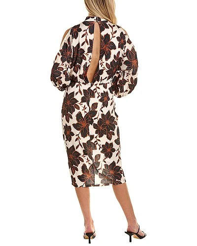 - 3/4-Sleeve Sheath Dress in black white floral with mock neck, cold-shoulder balloon sleeves, front slit at hem, and open back