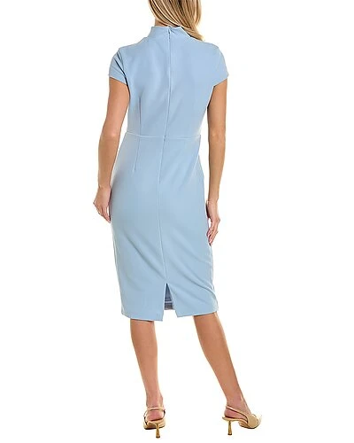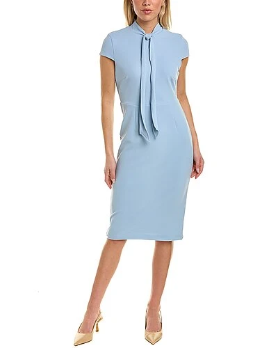 - Carolina Sheath Dress in halogen blue with bow mock neck, cap sleeves, and back slit at hem