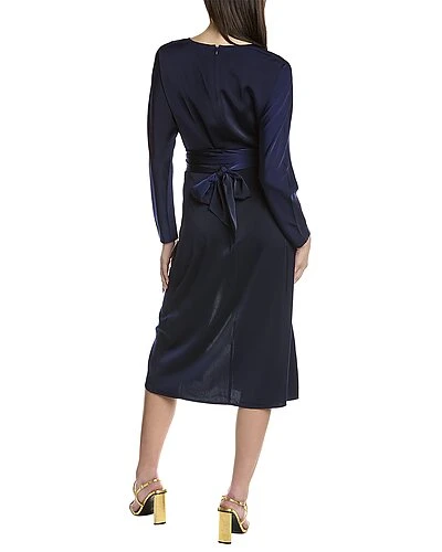 - Draped Midi Dress in navy with tie-sash at waist and center front slit at hem
