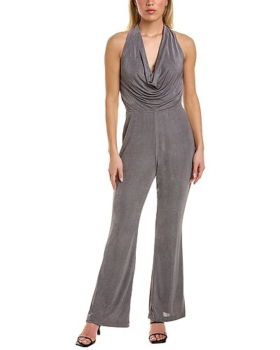 - Leilani Jumpsuit in silver with cowl neck, open back, elasticized waist, and slight flare leg