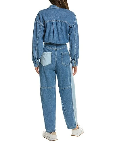 - Denim Jumpsuit in indigo with single chest pocket, dual side pockets, belt loops, and button cuffs
