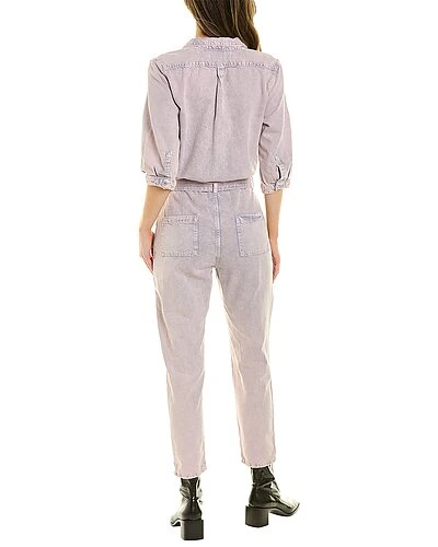- Frida Linen-Blend Jumpsuit in lilac with spread collar, elbow sleeves, button cuffs, belted waist, dual front pockets, and dual back pockets