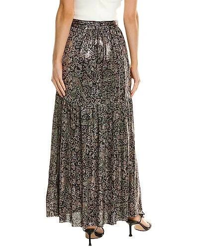 - Maxi Skirt in black multicolor with tiered hem, ruched waist, and metallic design
