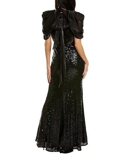 - Drape Bodice Gown in black with sequined design and draped cape shoulders