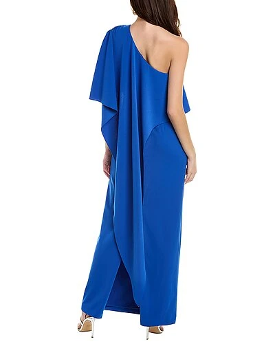- Drape Gown in indigo with one-shoulder style, capelet at back and vent at back