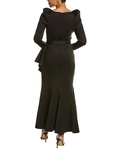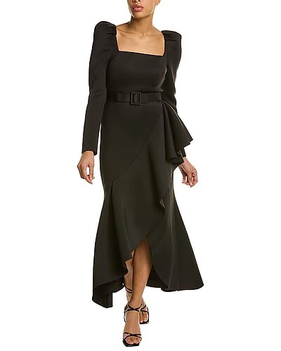 - Draped Flounce Day Dress in black with square neckline, pleated shoulders, ruffle cascade at skirt, belted waist, and high-low hem