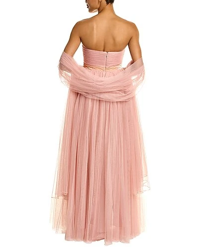 - Tulle Babydoll Gown in blush with strapless bodice, inner gripping at neckline, velvet waistband, and removable sash