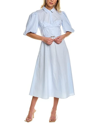 - Design details: spread collar, corset seaming, built-in boning, puff sleeves and belted waist