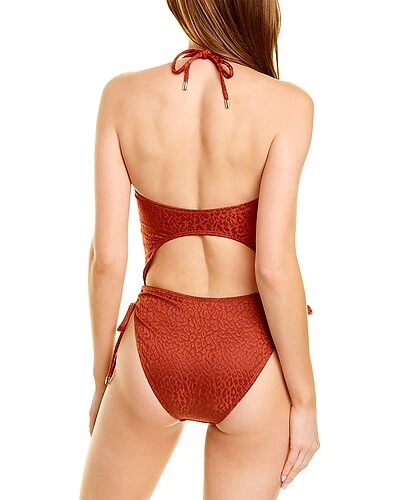 - Bandeau One-Piece in paprika with self-tie halter neck, removable soft cups, cutout design, self-tie drawstring accents and gold-tone hardware