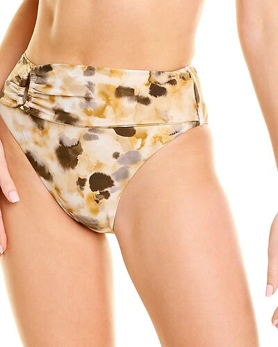- Belted High-Waist Bikini Bottom in beige with high-waist with ruched belt and gold-tone ring accent