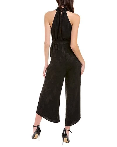 - Fil Coupe Jumpsuit in black with twisted halter neck, keyhole button front, elasticized waist, two front pockets, and tie sash at waist