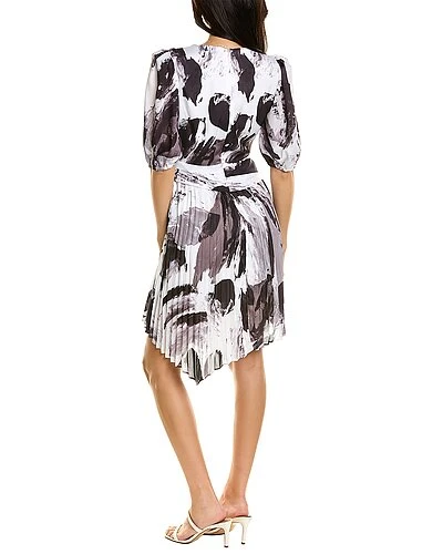 - Pleated A-Line Dress in black/white with surplice neckline, puff sleeves with elasticized cuffs, self-tie waist detail and pleated skirt