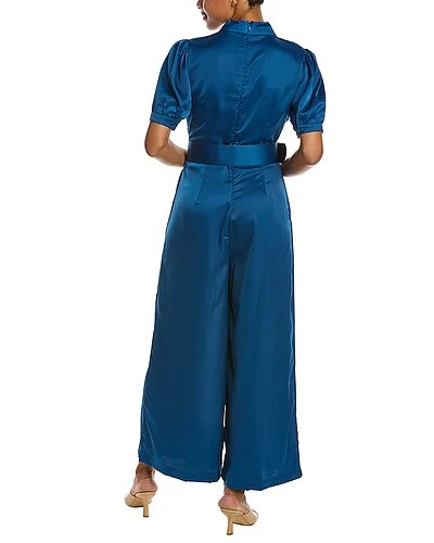 - Pleated Jumpsuit in teal with pleated leg, surplice bust, dual side pockets, and belted waist
