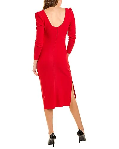 - Midi Dress in red with scoop neck, pleated left waist, and vented right hem
