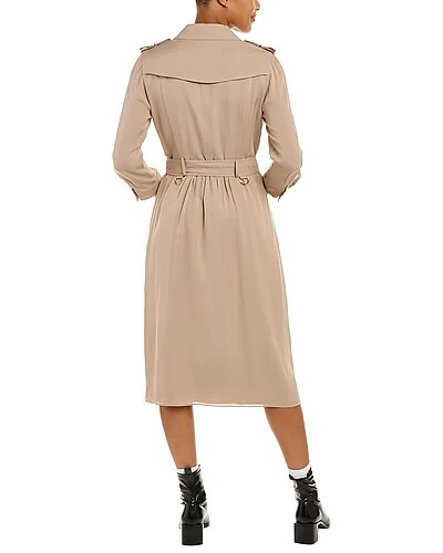 - Wrap Silk Trench Dress in nude with notch lapel, epaulettes, 3/4-length sleeves, button cuffs, layered skirt, and belted waist