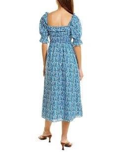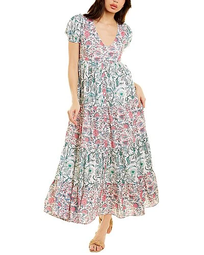 - Design details: V-neck, puffed sleeves, elasticized cuffs, dual side on-seam pockets, and tiered skirt