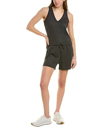 - Double V Romper in black with V-neck, dual front angled pockets, and elasticized drawstring waistband