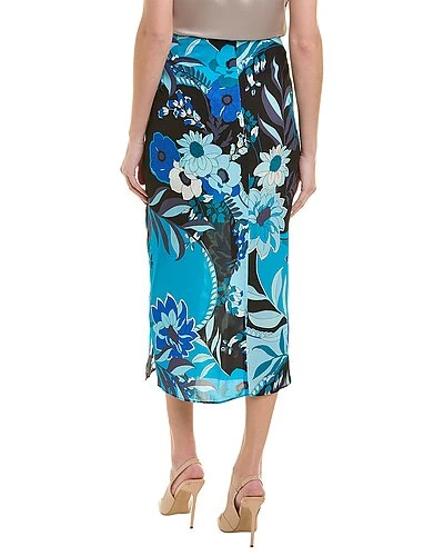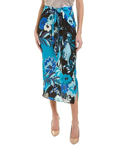 - Nouveau Midi Skirt in teal multicolor with twisted front faux wrap silhouette