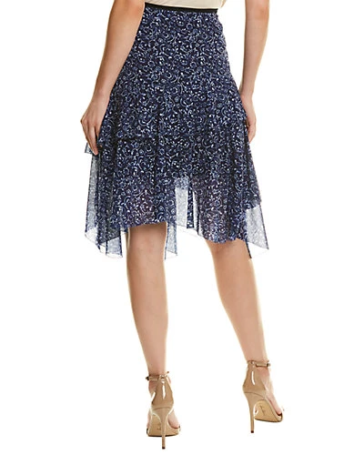 - Sharon Silk Midi Skirt in regal multicolor with floral chiffon design and handkerchief hem