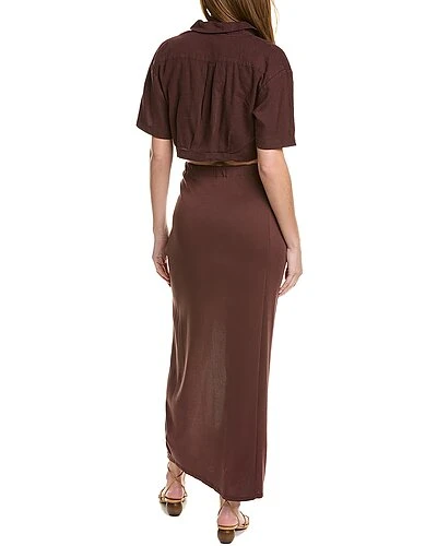 - 2pc Kabella Linen-Blend Top & Skirt Set in brown multicolor with crop top with spread collar and button front and pull-on skirt with drawstring waist and split hem