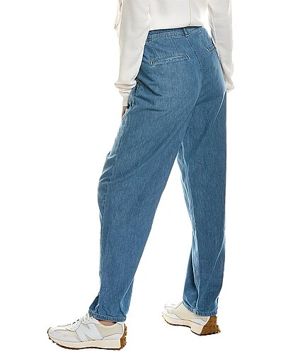 - Luna Denim Pull-On Pant in blue with elasticized drawstring waist, pleated front, and four-pocket styling