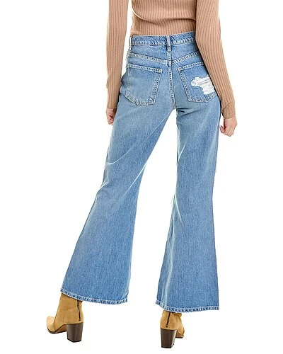 - New Dawn Flare Jean in Victoria blue with belt loops, whiskering and fading details, distressed detailing, and classic five-pocket styling