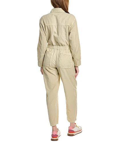 - Quinn Linen-Blend Coverall in thistle seed with spread collar, chest pocket, smocked waist with self-tie belt, dual front pockets and rolled hem