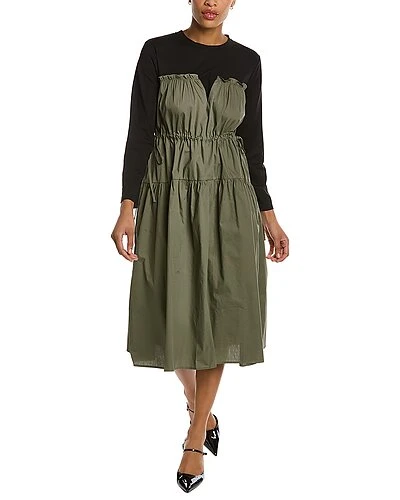 - Dress in olive with tiered design and drawstring waist