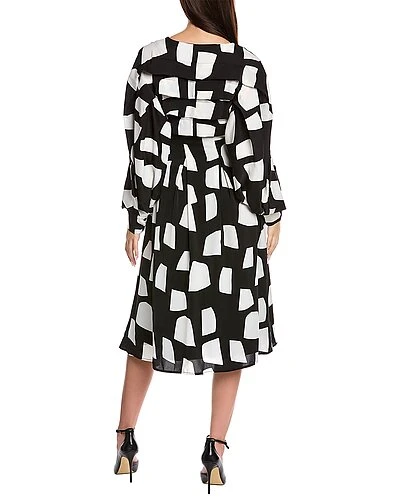 - Layered Dress in black with pleated chest, blouson sleeves, button cuffs, dual side on-seam pockets, and pleated skirt