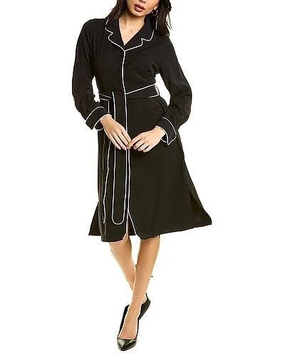 - Piped Shirtdress in black with notch lapel, button cuffs, two front pockets, tie belt at waist, and slits at hem