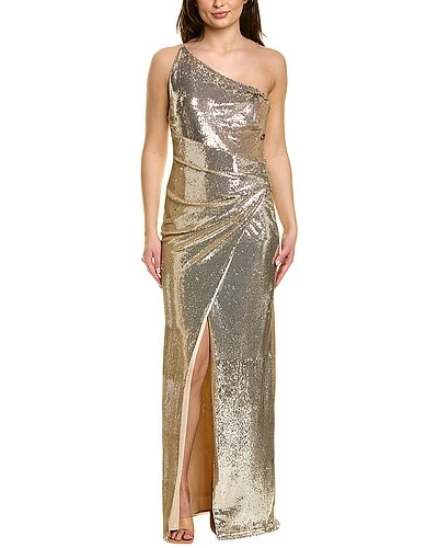 - Design details: sequin design, one-shoulder neckline, pleated detail at waist and crossover skirt front