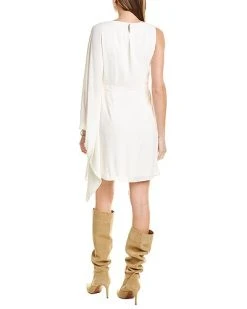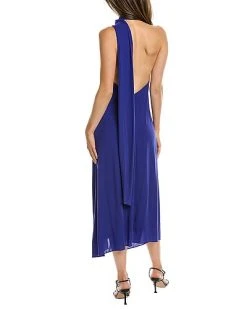 - Design details: twisted halter neck, plunging keyhole cutout, walk-thru skirt, open back
