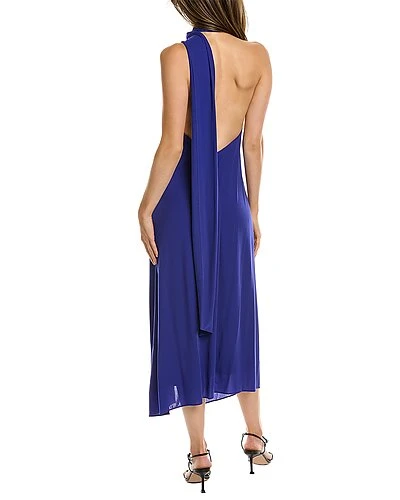 - Design details: scarf halter neck, open back, asymmetrical hem with slit