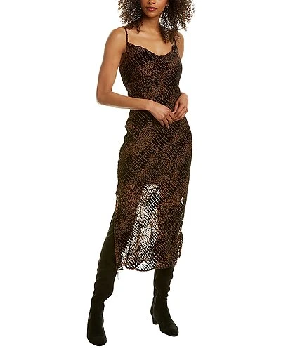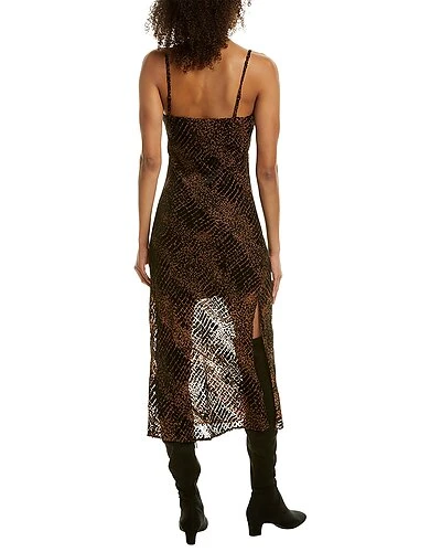 - Design details: flocked design, adjustable shoulder straps, cowl neck, right side seam slit at hem and midi length