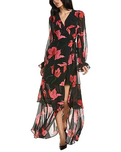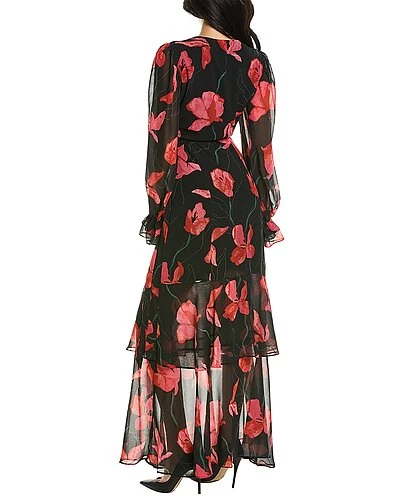 - Design details: sheer balloon sleeves with elasticized flounce cuffs, tiered hem