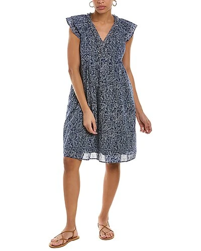 - Ottlie Mini Dress in navy and white combo with flare sleeves and eyelash fringe trim