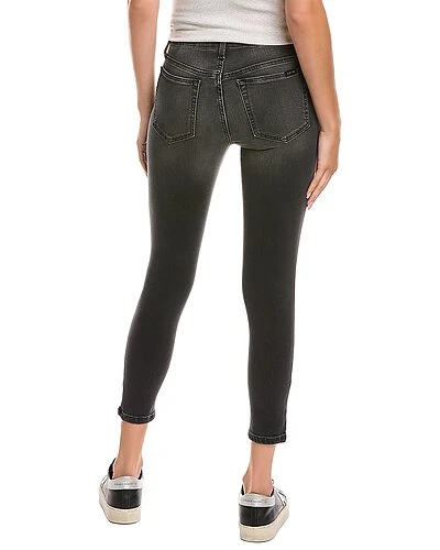 - Curvy Skinny Crop in black with belt loops, whiskering and fading details, distressed knees, and classic five-pocket styling