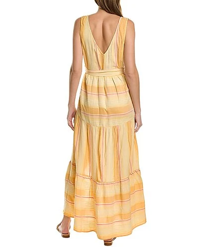 - Clara Dress in Cozumel stripe with slits at front, removable tie belt, and tiered shirring