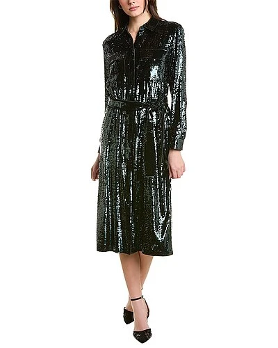 - Doha Shirtdress in dark seaweed with sequined design, spread collar, dual chest pockets, button cuffs, dual side on-seam pockets, and self-tie sash at waist