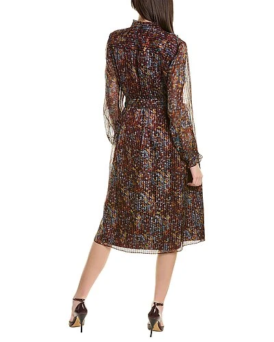 - Harlan Silk-Blend Dress in antique ruby multicolor with mock neck, ruffled trim, button cuffs, and self-tie sash at waist