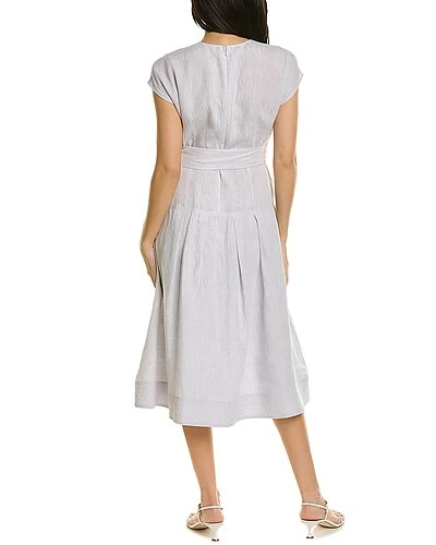 - Remington Linen A-Line Dress in pebble melange with V-neck with chain trim, dolman sleeves, self-tie sash at waist, pleated skirt, dual side on-seam pockets