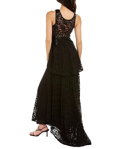 - Brent Gown in black with lace design, peplum hem at waist, high-low hem, and train at back hem