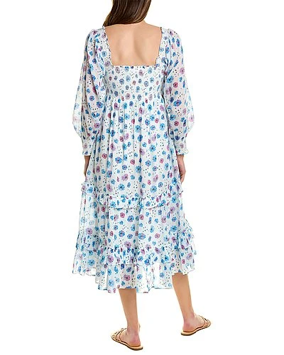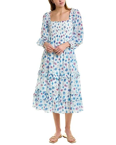 - Miri Midi Dress in deep cotton candy with smocked bodice and cuffs, tiered skirt and ruffle trim