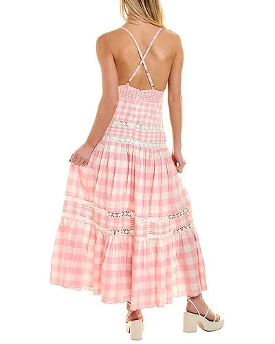 - Roan Maxi Dress in groovy pink with V-neck, floral applique at center bust, lace trim, and tiered skirt