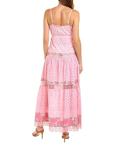 - Umi Maxi Dress in frosted berry with adjustable spaghetti straps, V-neck, embroidered eyelet design and lace paneling